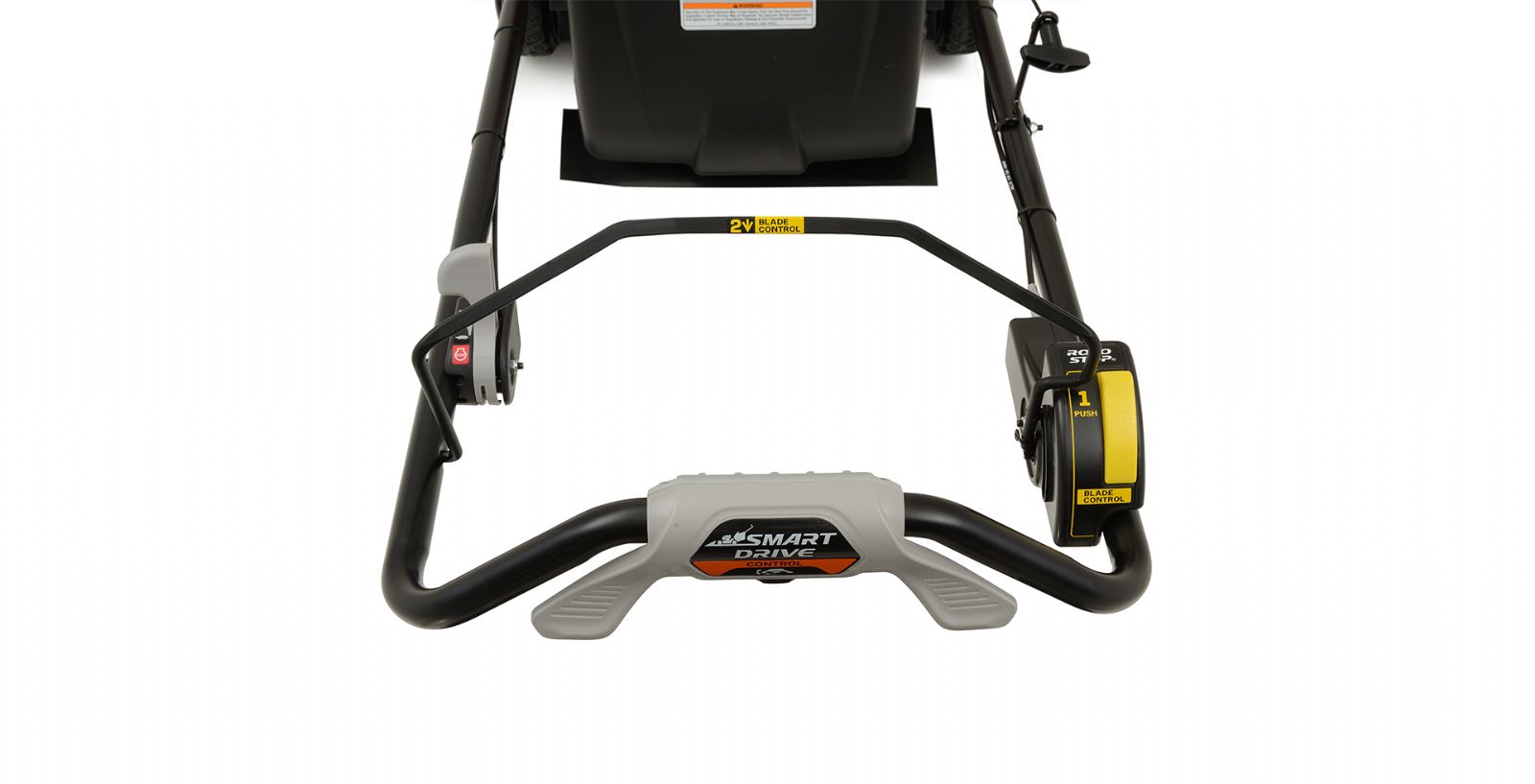 Outro importante dispositivo é o sistema de comando Smart Drive, ajustável, e que permite controlar a velocidade de operação e oferece plena segurança, pois basta tirar as mãos do controle para que o cortador de grama pare.