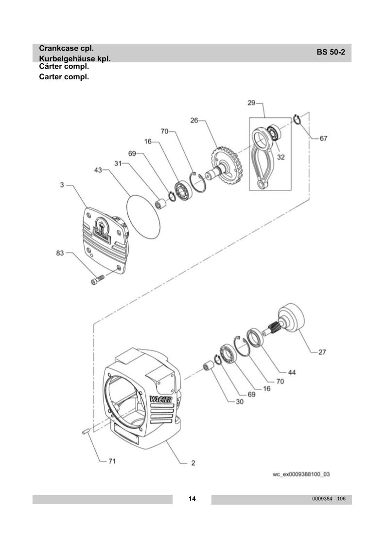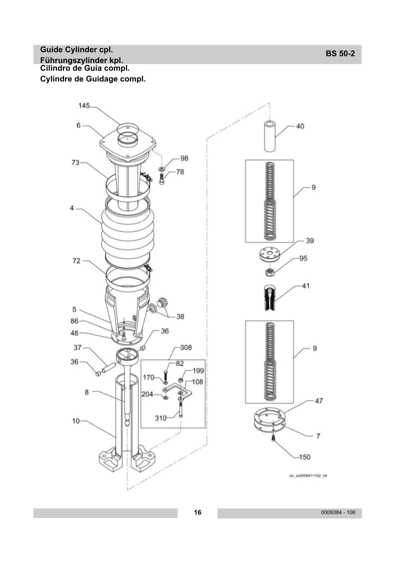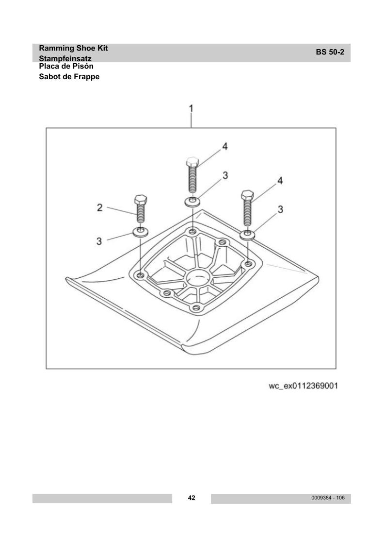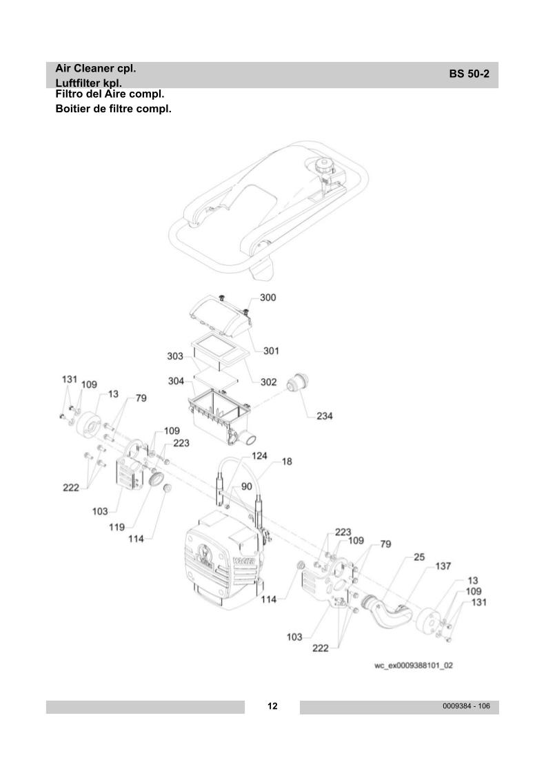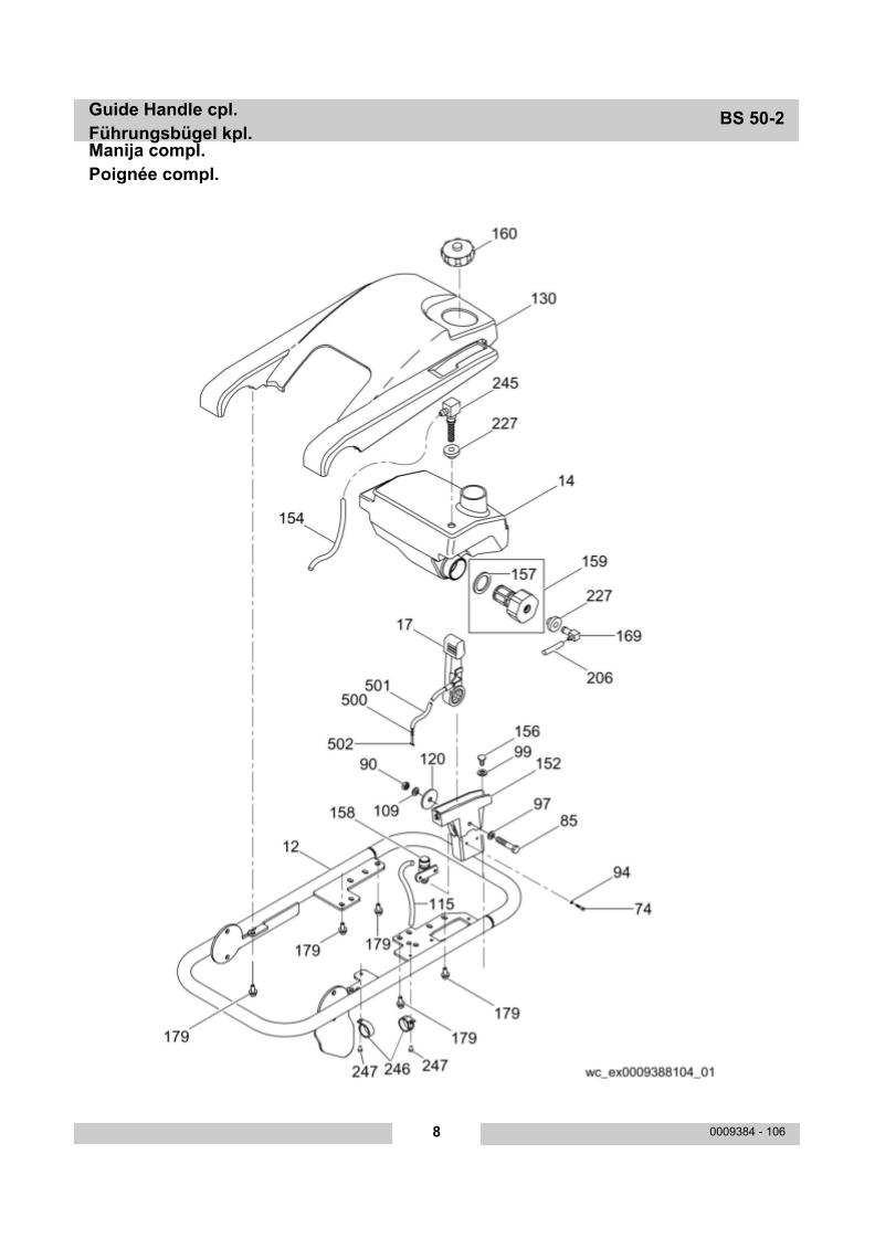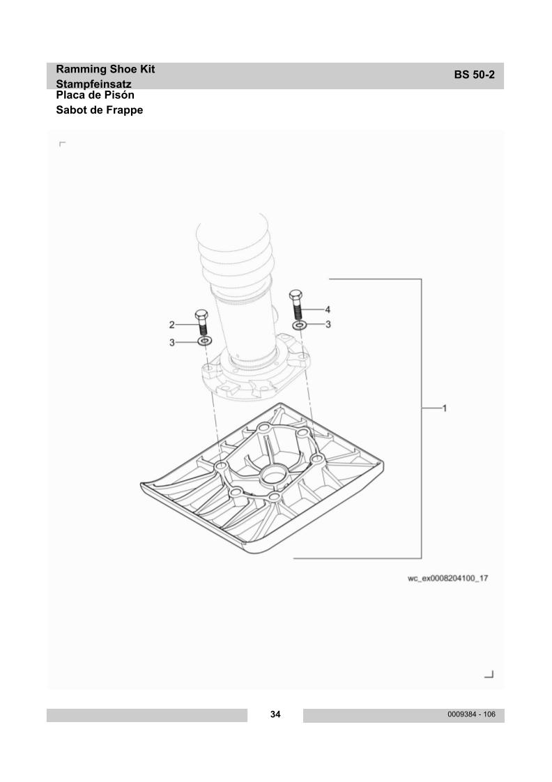 Vista explodida com todas as peças do compactador de solo BS50-2 do fabricante Wacker Neuson!